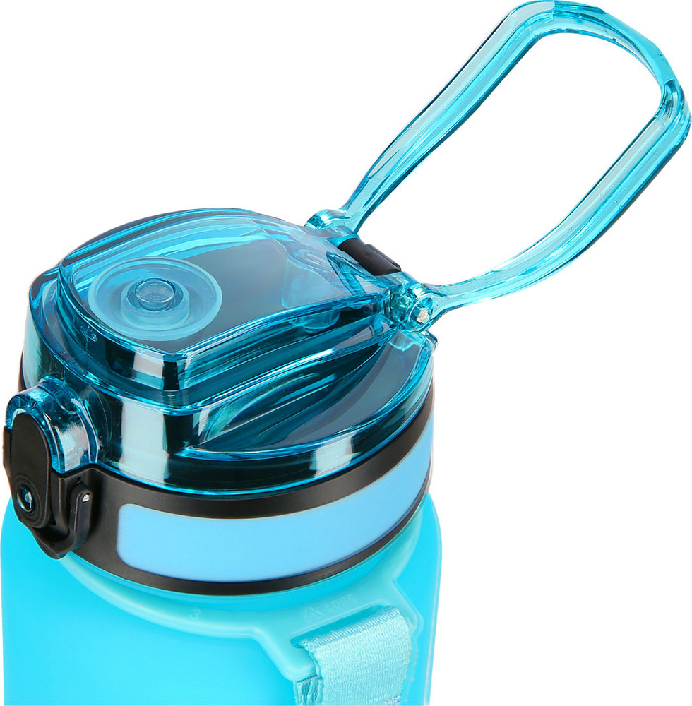 Dodatkowo butelka posiada plastikowy uchwyt oraz pasek na nadgarstek.