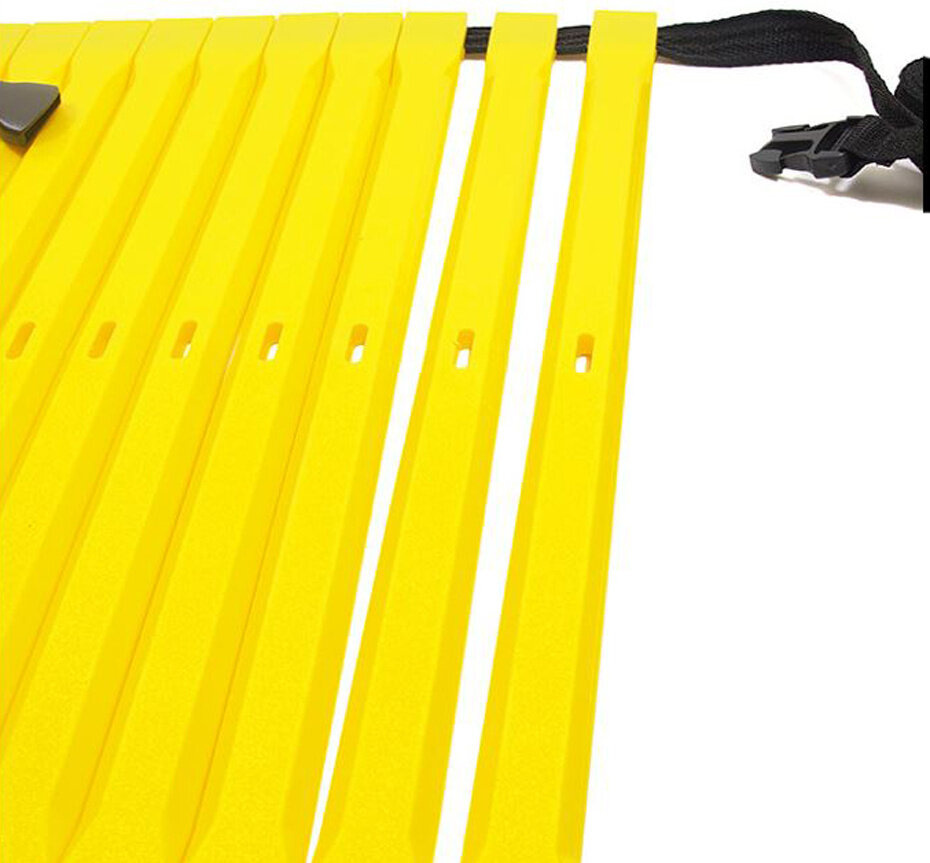 Drabinka koordynacyjna wykonana z mocnego żółtego tworzywa PCV (szczebelki) oraz taśmy polietylenowej w kolorze czarnym to idealne narzędzie do zestawiania różnych ćwiczeń rozwijających pracę nóg.
