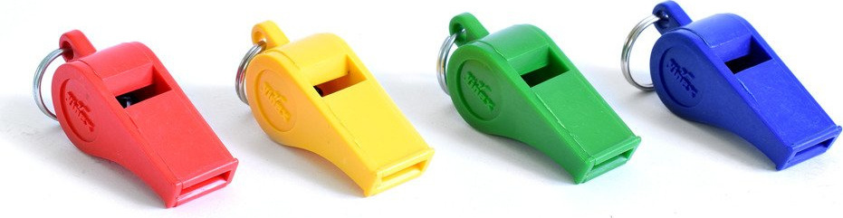 - Komplet gwizdków w 4 kolorach: zielony, czerwony, niebieski, żółty