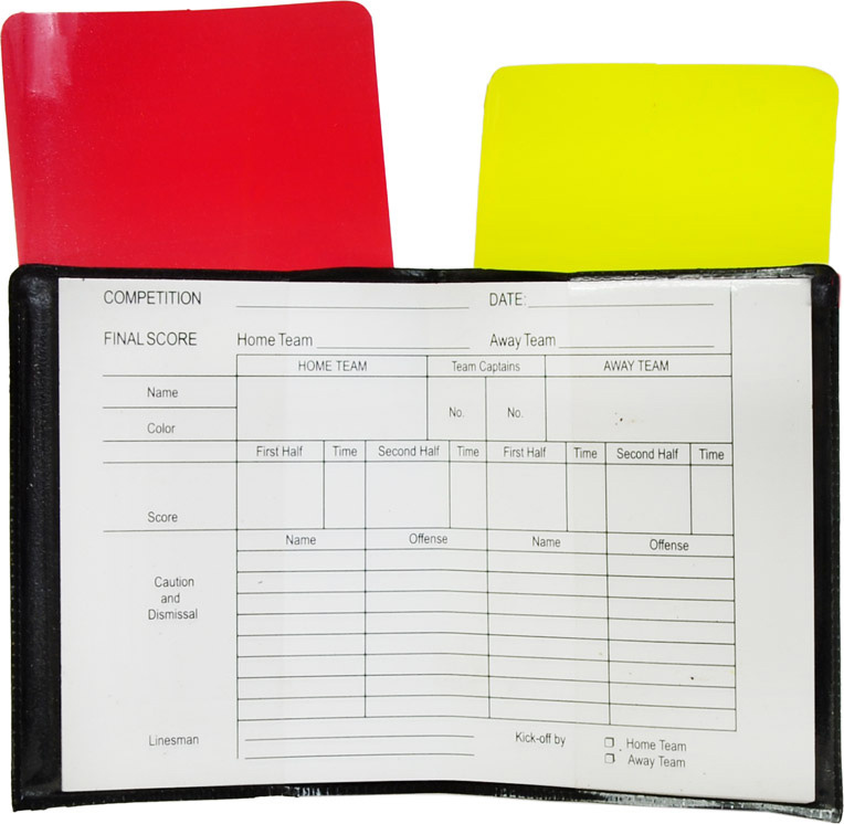 Komplet kartek w plastikowym etui to niezbędny rekwizyt każdego sędziego czuwającego nad przebiegiem meczu piłki nożnej.