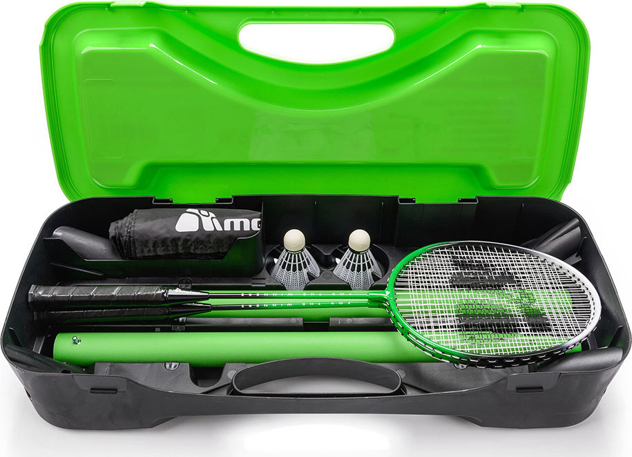 W poręcznym, plastikowym pudełku z wygodnym uchwytem znajdziemy przede wszystkim dwie rakietki, dwie lotki, siatkę oraz plastikowe słupki.