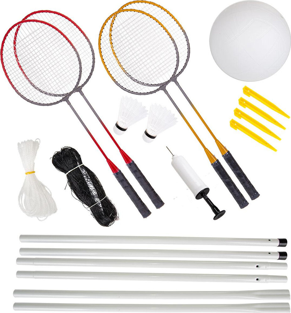 - urozmaicenie zapewnią 4 rakiety, siatka, słupki, 2 lotki, piłka, pompka