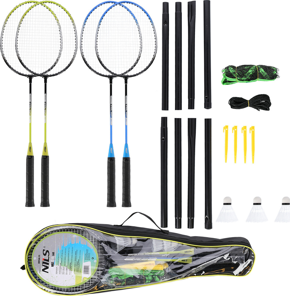 Zestaw 4 rakiet do badmintona 3 lotki siatki 195x22cm pokrowiec Nils NRZ014 steel