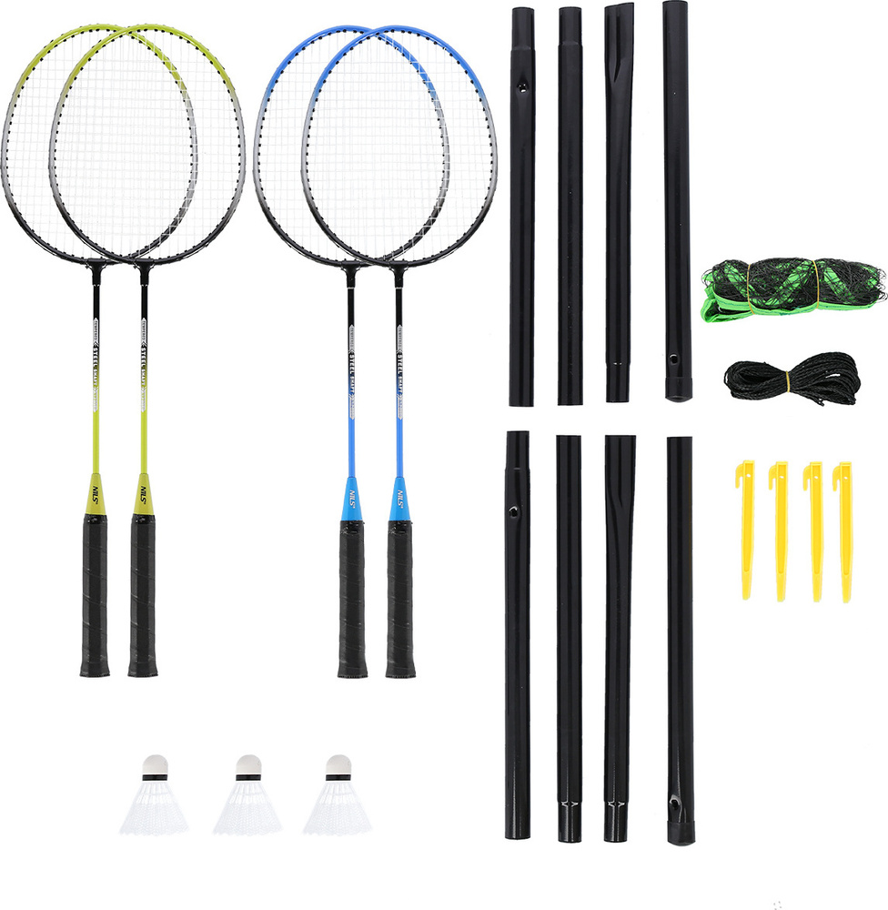 W skład zestawu wchodzą 4 rakiety, zestaw 3 nylonowych lotek, 2 składane słupki i nylonowa siatka, dzięki czemu użytkownik posiada wszystko, czego potrzebuje, żeby rozpocząć trening.