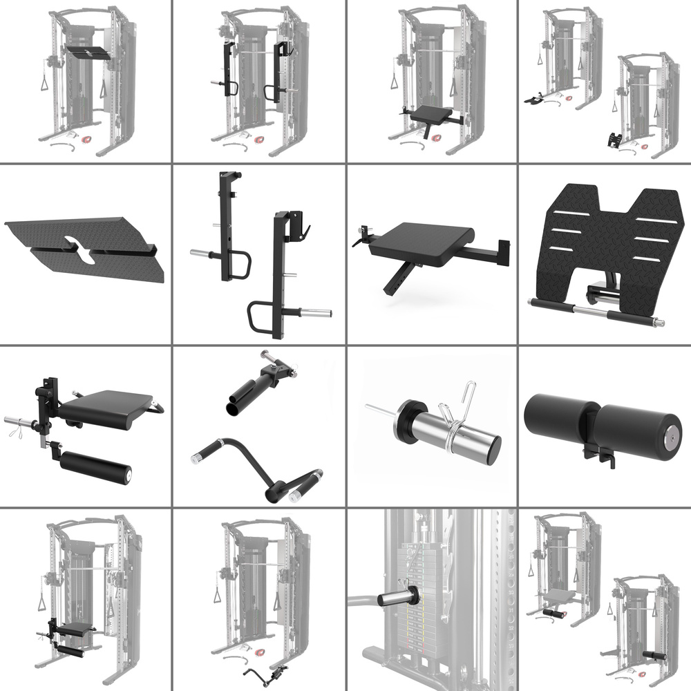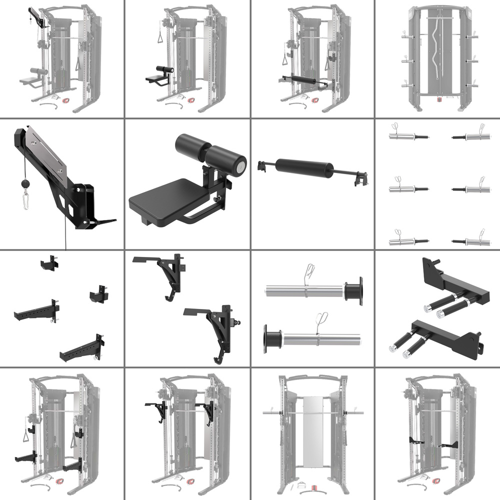 Zestaw Cyklop 10 posiada wiele akcesoriów: Przedłużenie wyciągu górnego, Siedzisko z blokadą, Piankowe blokady na uda, Sześć bolców do przechowywania obciążeń, Uchwyty na gryf, Podpory bezpieczeństwa, Monolift, Nakładki na gryf Smitha pod talerze olimpijskie, Uchwyty do dipów, Płytę do wypychania na nogi, Ruchome ramiona (jammer arms), Oparcie do hip thrustów, Płytę na stopy do brzuszków, Siedzisko do prostowania nóg (leg extension), Uchwyt landmine do wiosłowania wraz z chwytem, Magnetyczny bolec na dodatkowe obciążenia, Zaciski sprężynowe.