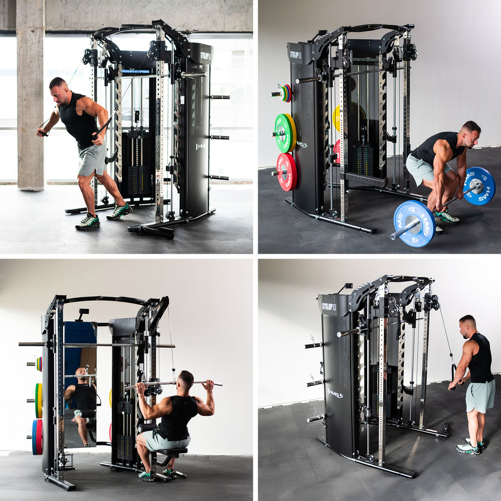 Dzięki dwóm precyzyjnym stosom po 90 kg oraz sprytnemu mechanizmowi łączenia gryfu Smitha ze stosem możesz trenować na wolnym ciężarze, na stosie, albo… na obu jednocześnie.