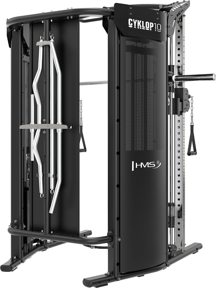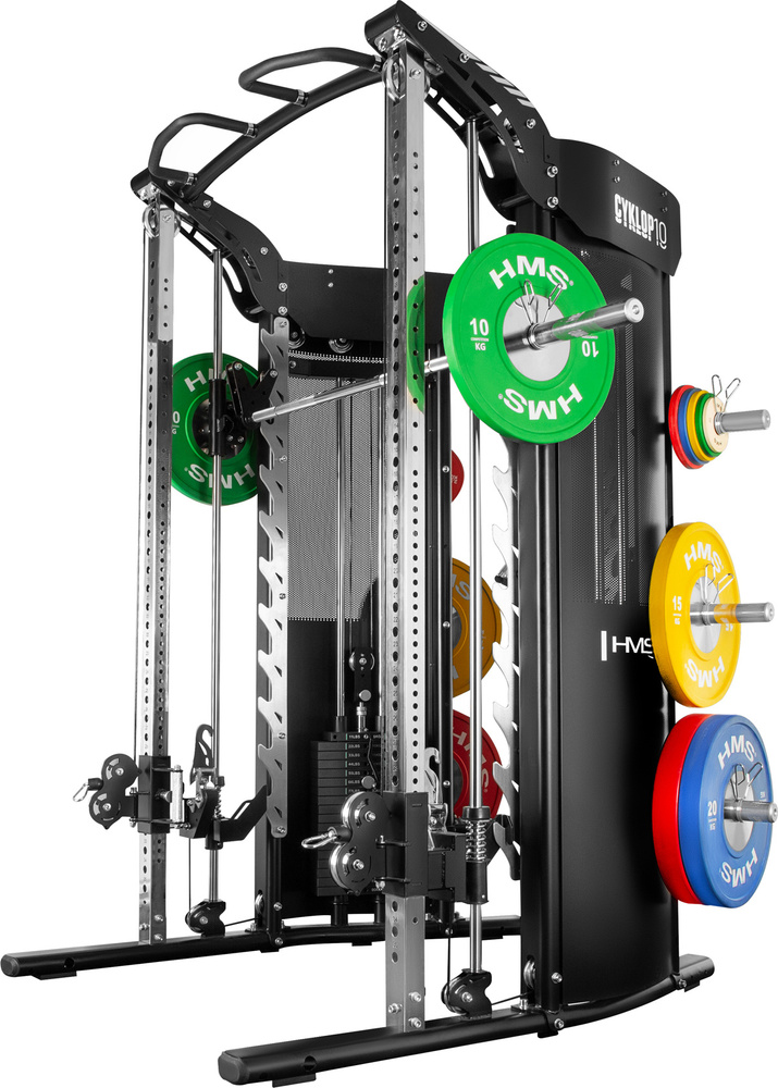 Cyklop 10 to zaawansowany atlas treningowy – kompletna stacja 3w1 łącząca suwnicę Smitha, power rack i bramę z wyciągami.