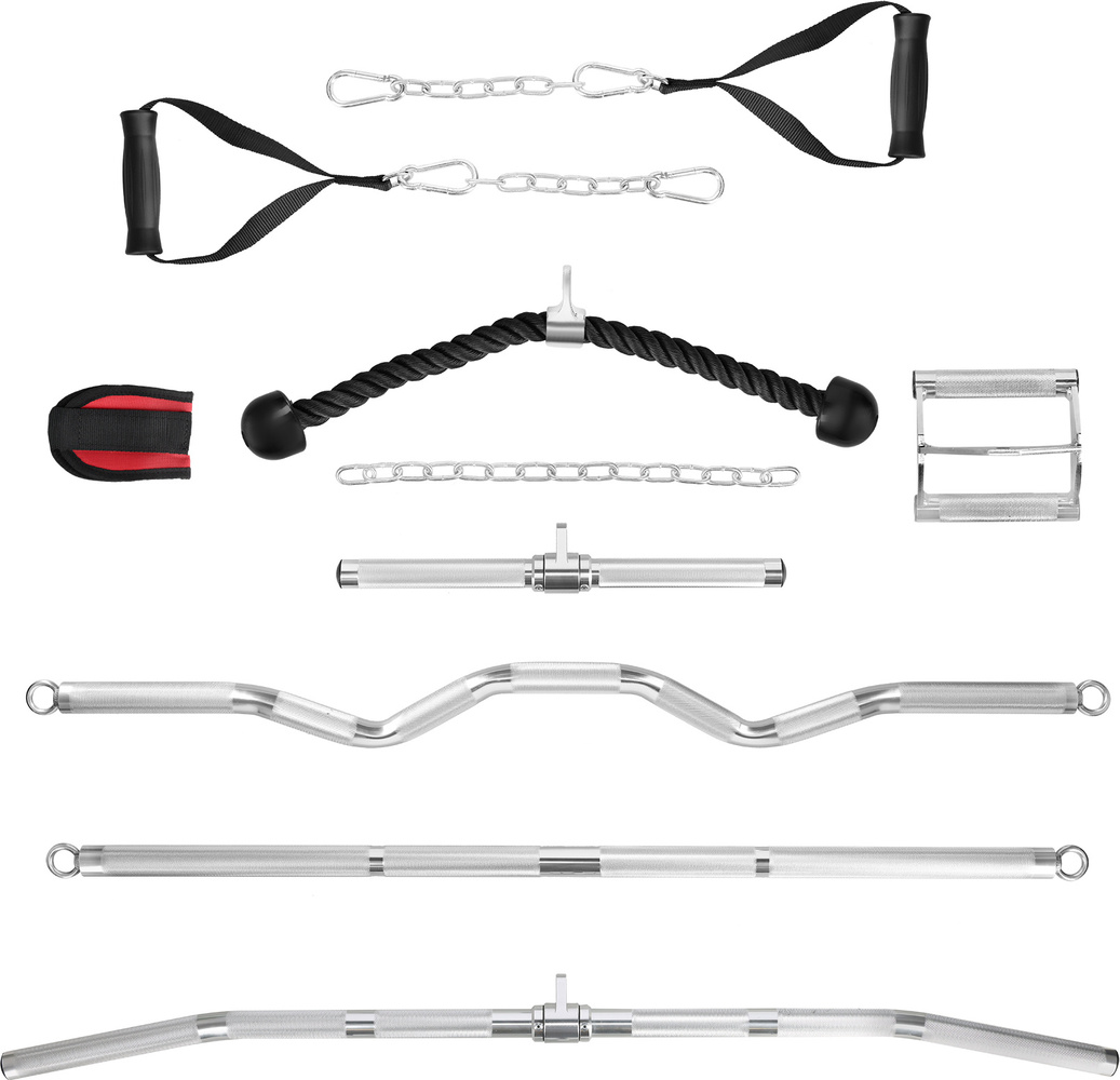 W komplecie otrzymujesz bogaty pakiet uchwytów do wyciągów, dzięki którym zbudujesz pełny plan na plecy, klatkę, barki, ramiona, pośladki i brzuch: 2× pojedynczy uchwyt typu D-handle, Sznur do tricepsa, Podwójny wąski uchwyt (close-grip), Łańcuchy, Uchwyt na kostkę, Prosty krótki uchwyt, Drążek łamany (EZ), Długi drążek prosty, Długi drążek skośny.