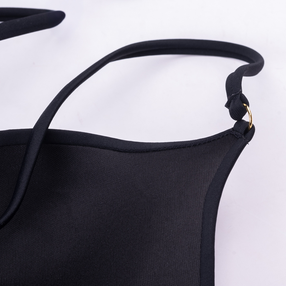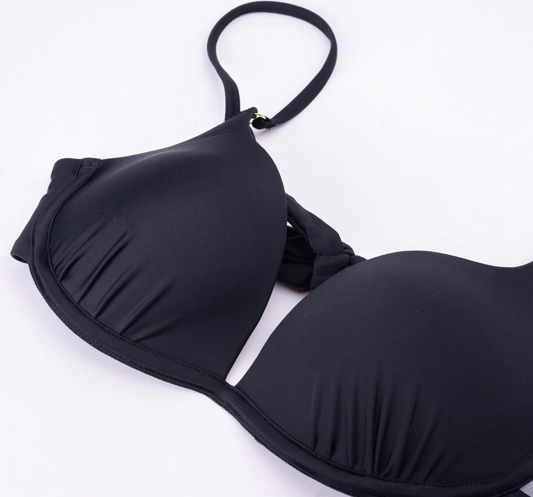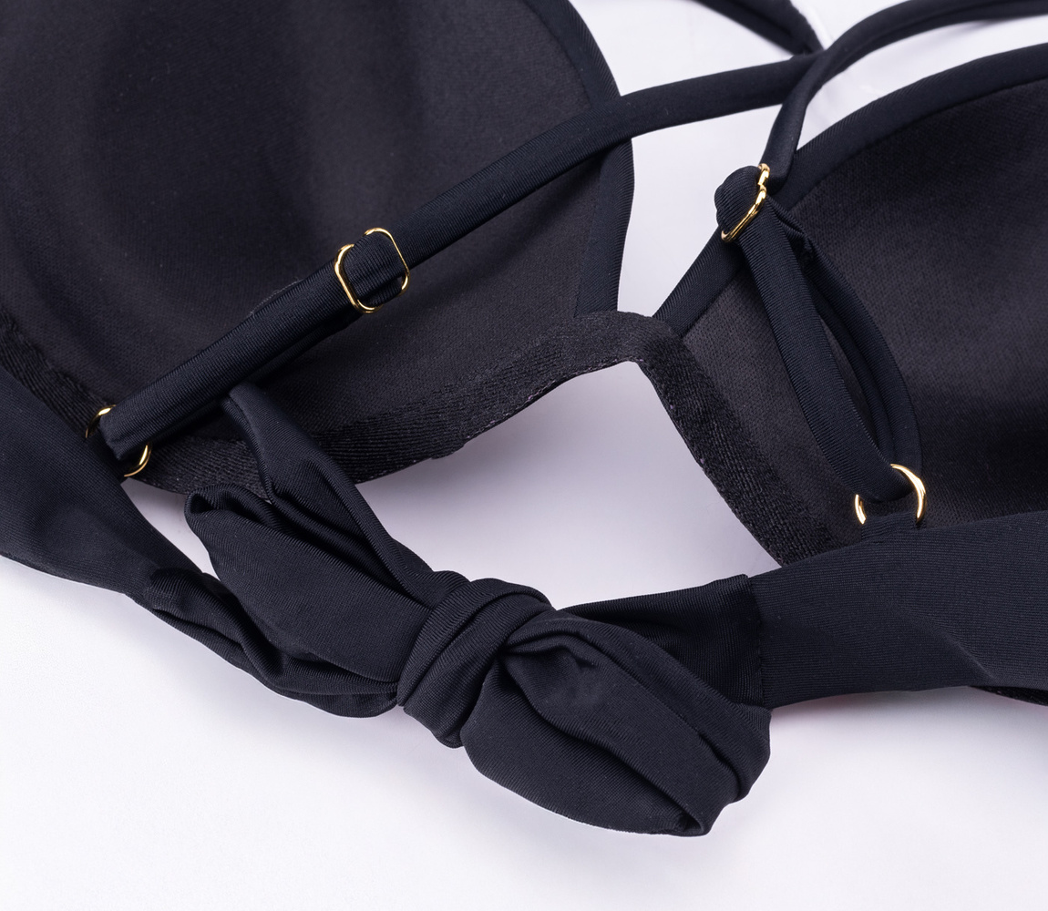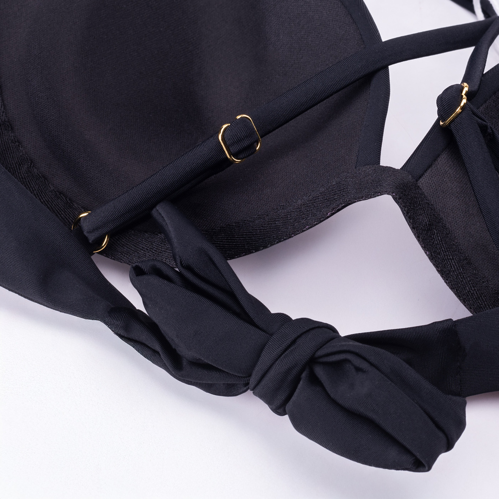 Wiązanie z tyłu oraz regulowane ramiączka pozwalają indywidualnie dopasować górną część stroju.