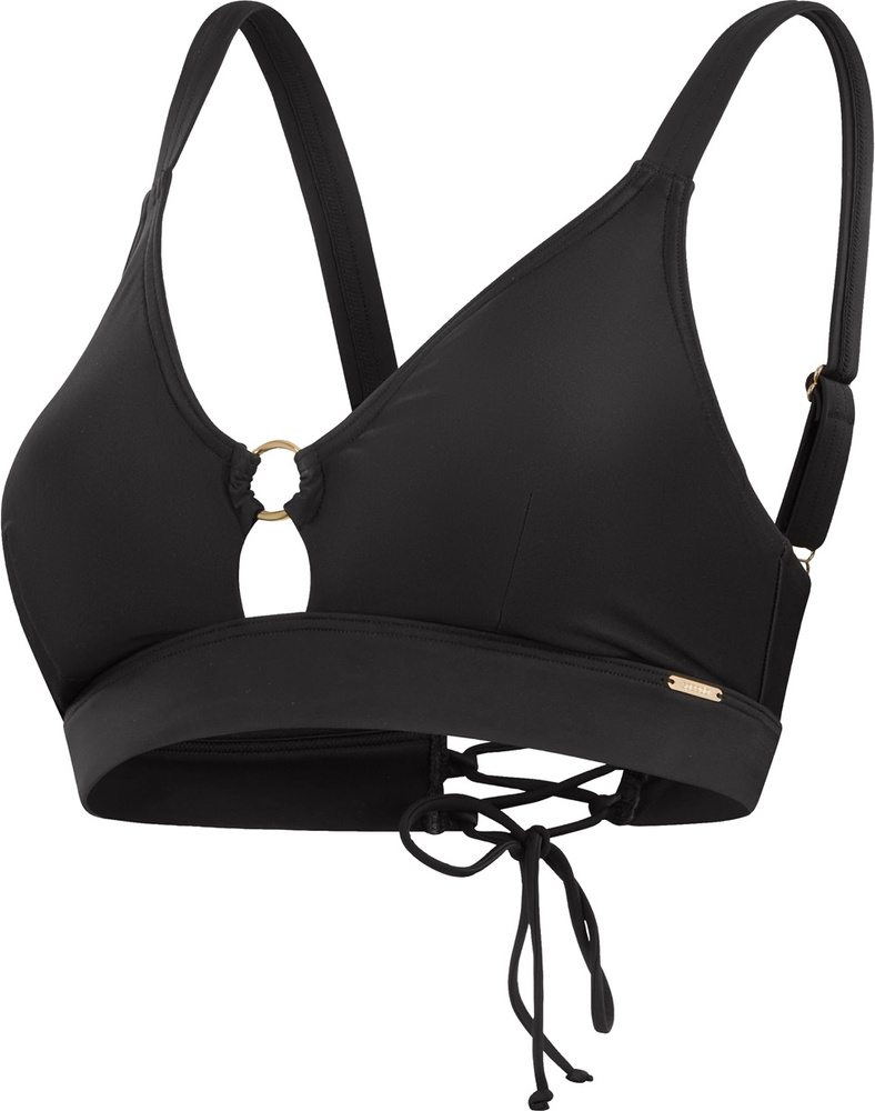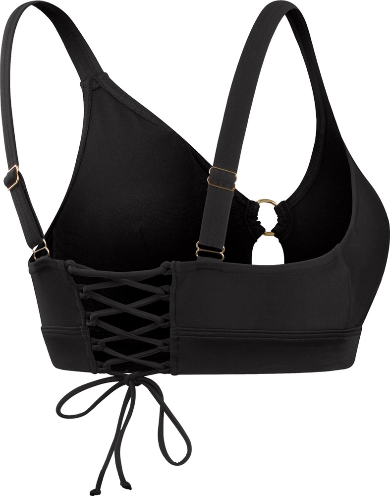 Stylowy, czarny stanik bikini z dekoltem w kształcie litery v i sznurowanym tyłem dla indywidualnego dopasowania.