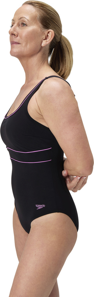 Sportowy strój kąpielowy contour eclipse łączy klasyczny, prostokątny dekolt z przyciągającym wzrok nadrukiem cyfrowym, który optycznie wysmukla sylwetkę i kieruje wzrok ku górze.