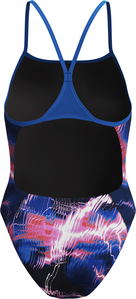 Cienkie ramiączka odsłaniające ramiona oraz wysokie wycięcie na nogi zapewniają swobodę ruchów i wygodę bez rozpraszania.