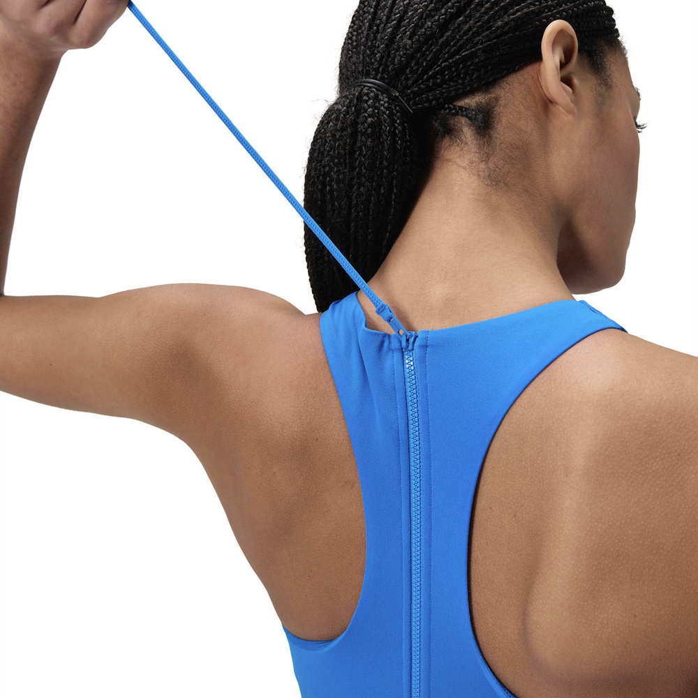 Pokonuj kolejne treningi, czując pełne wsparcie dzięki eleganckiemu kostiumowi racer zip z wbudowanym biustonoszem, wysokim, stylowym dekoltem i zapięciem na plecach.