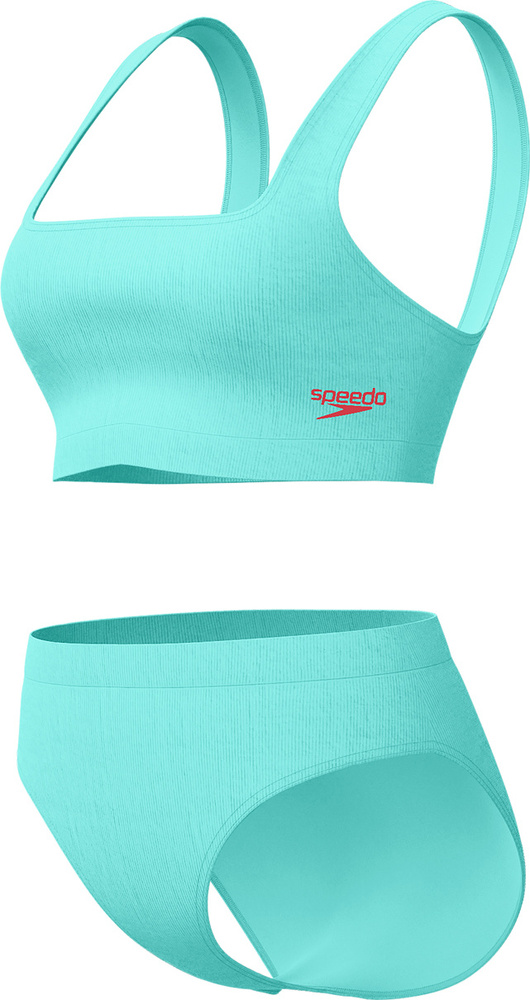 Dwuczęściowy kostium kąpielowy wykonany z prążkowanej tkaniny.