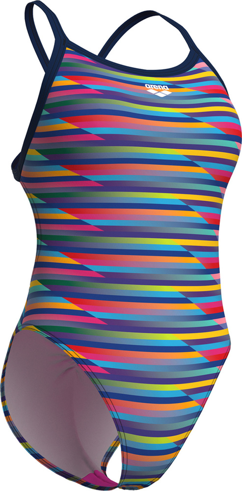 Klasyczny fason z odważnymi, wielokolorowymi paskami przyciąga wzrok, a wysokie wycięcie na nogi i krój xcross podkreślają sylwetkę i zapewniają pełną swobodę ruchu w wodzie.