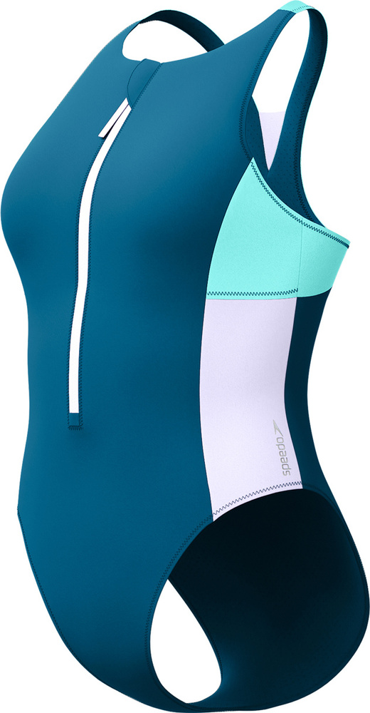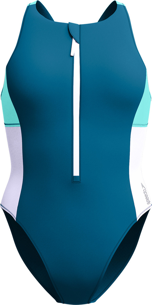 Sportowy krój z wysokim dekoltem, zamkiem z przodu i plecami typu racerback zapewnia pełną swobodę ruchów podczas treningów w wodzie.