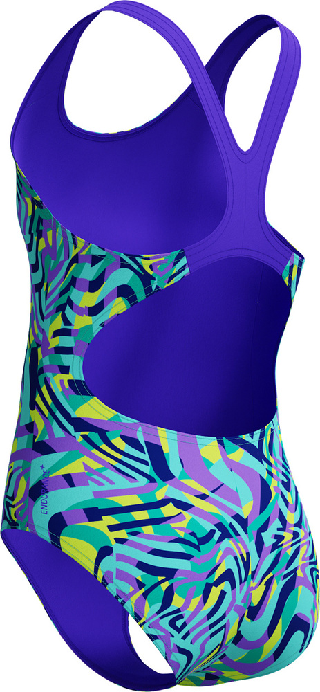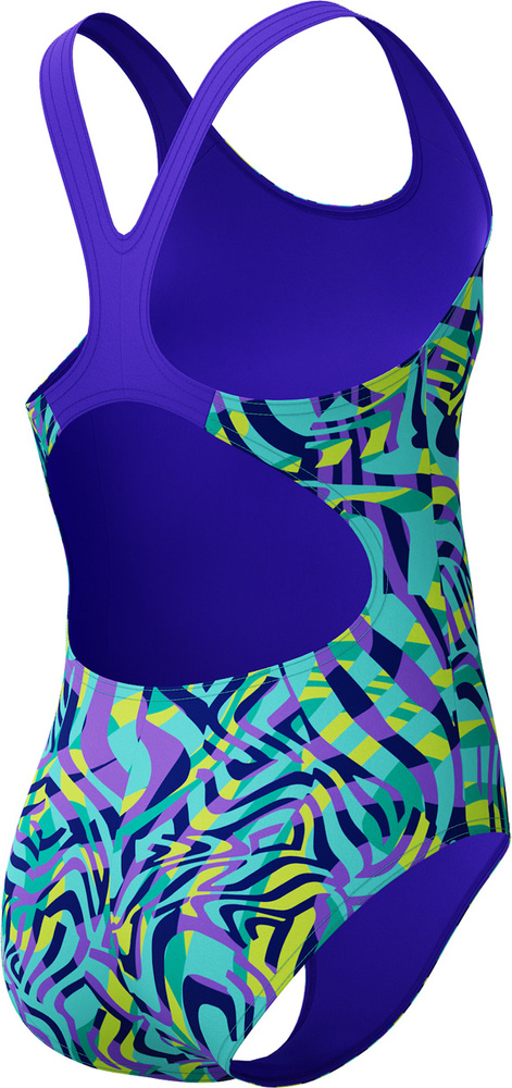 Wygodny fason typu splashback z ramiączkami odsuniętymi od ramion zapewnia swobodę ruchów w wodzie.