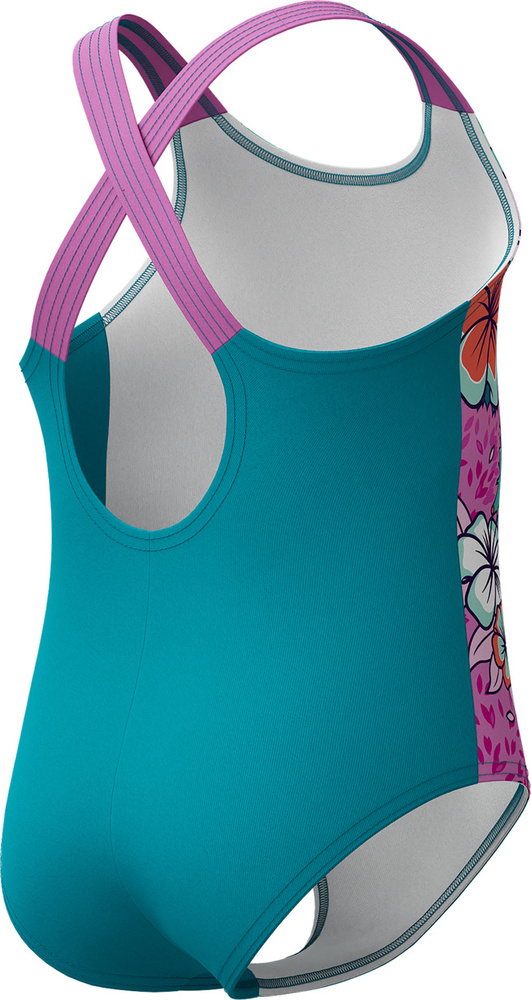 Kolorowy kostium z nadrukiem oraz krzyżowanym tyłem zapewnia pełną swobodę ruchów, zarówno w płytkiej wodzie, jak i podczas nurkowania.