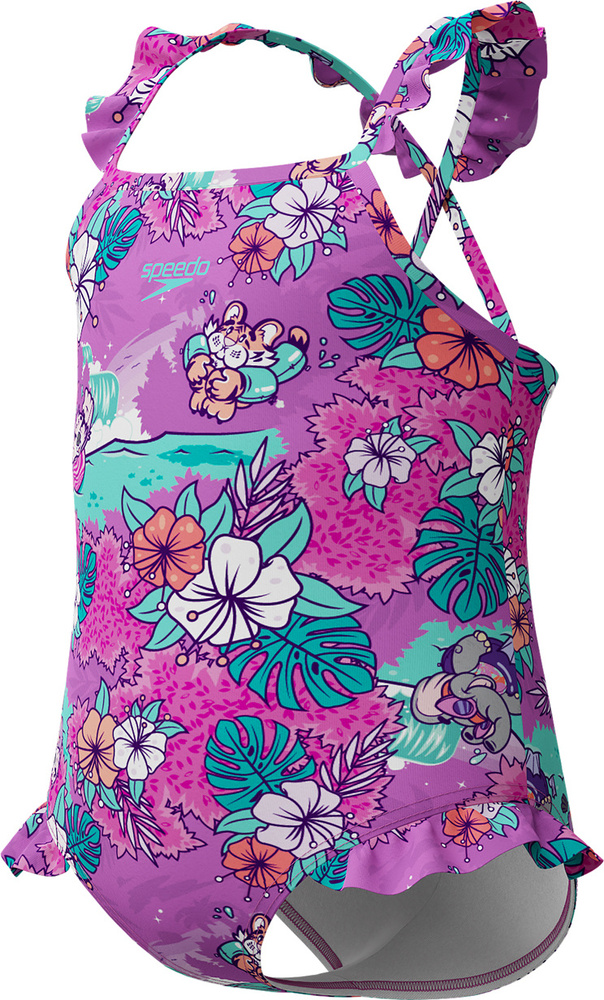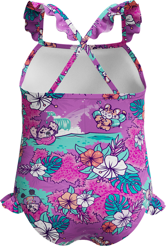 Kolorowy kostium z nadrukiem oraz krzyżowanym tyłem zapewnia pełną swobodę ruchów, zarówno w płytkiej wodzie, jak i podczas nurkowania.
