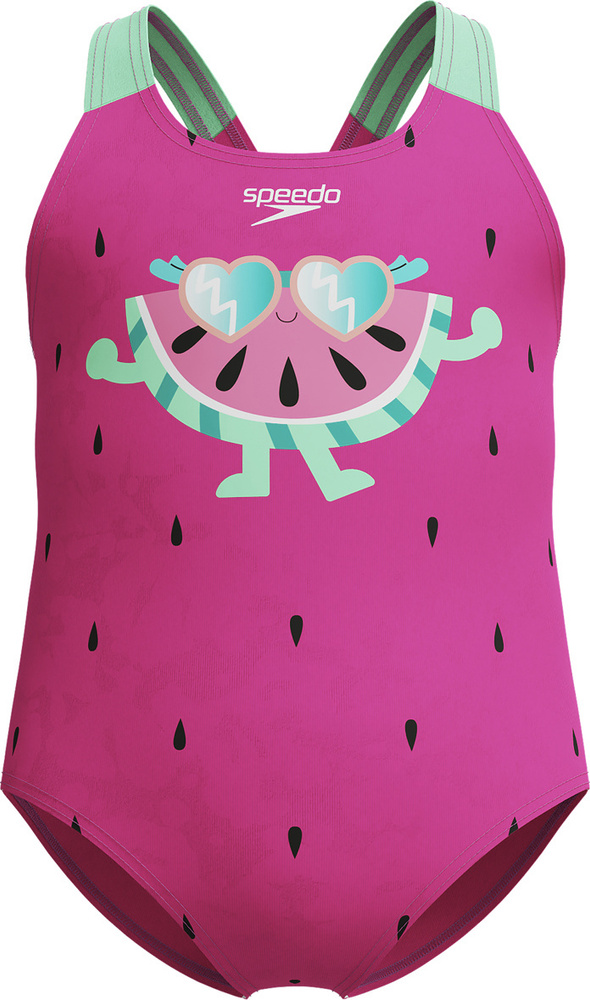 Uroczy, różowy strój kąpielowy ozdobiony słodkim motywem arbuza stworzony został z myślą o wakacyjnej zabawie.