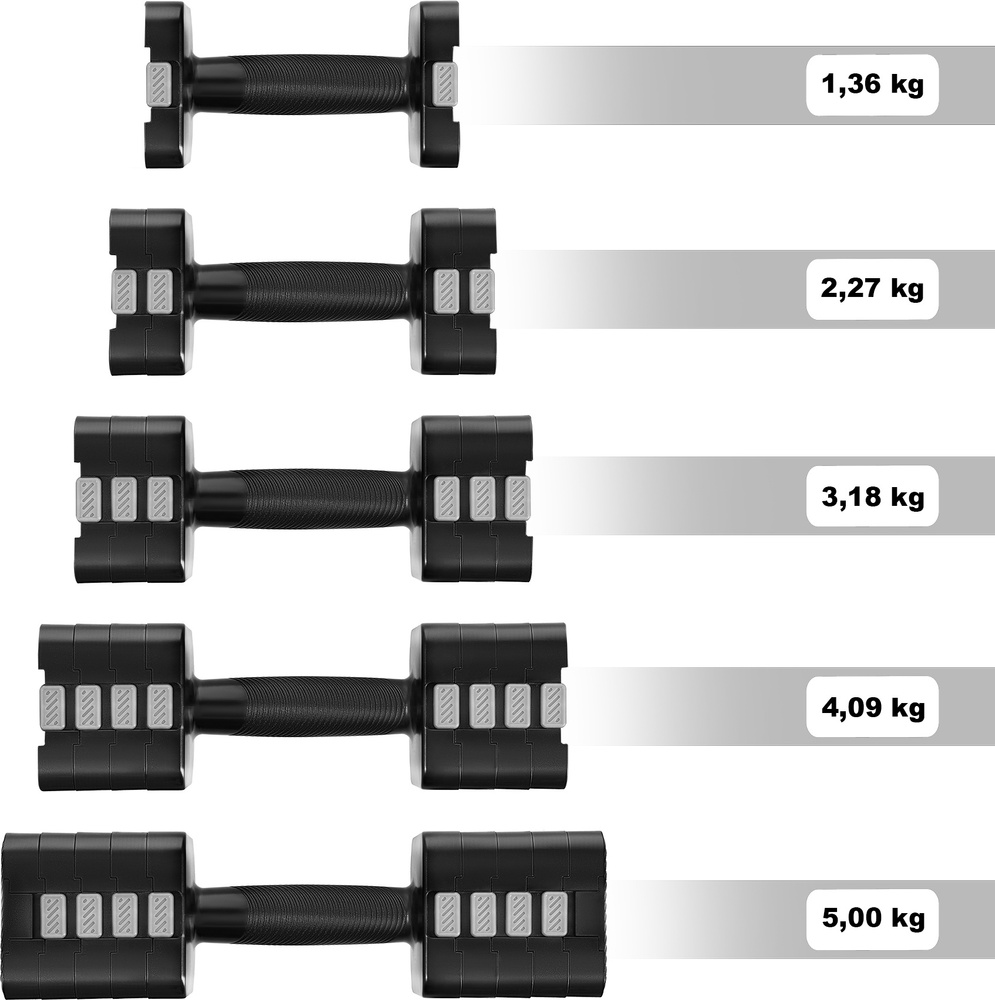 Jedna para zastępuje pięć par klasycznych hantli – oszczędzasz miejsce, czas i pieniądze.
