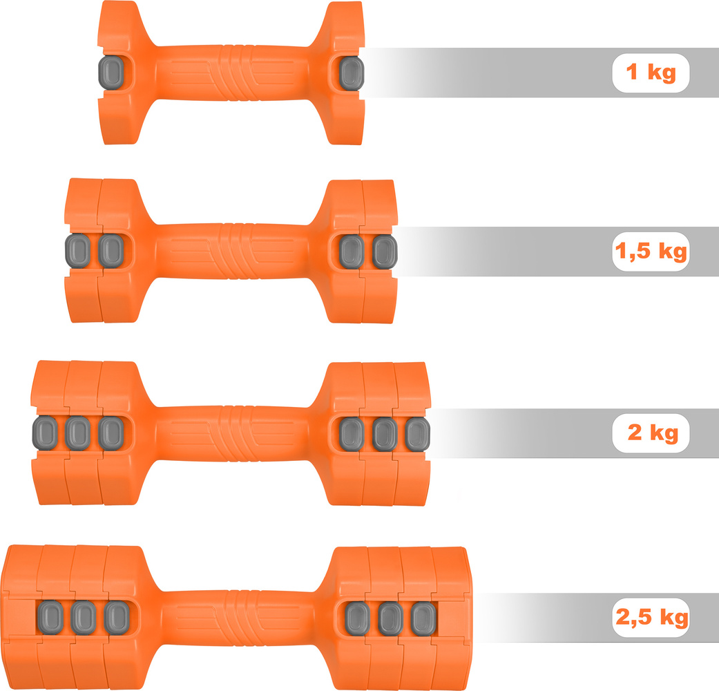 - Regulacja 4 w 1 w każdej hantli: 1 / 1,5 / 2 / 2,5 kg – dopasuj obciążenie do ćwiczenia.