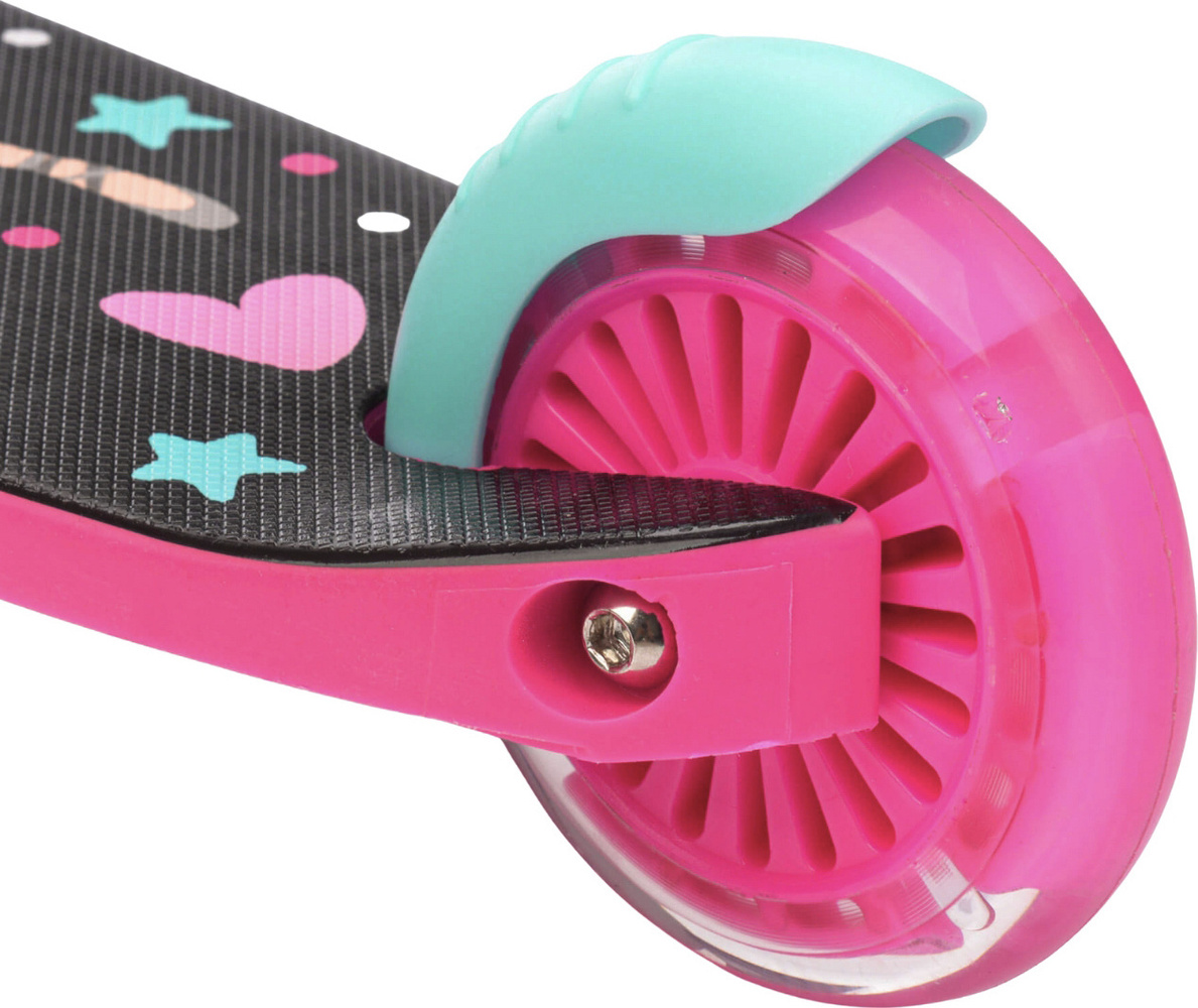 Dane techniczne:· Materiał: aluminium, PP· Kółka: PUC, czyli odlewany poliuretan, który jest bardziej odporny na ścieranie, daje płynniejszą jazdę· Średnica kół: 120x24 mm(przód), 100x24 mm (tył)· Łożyska: ABEC-7· Uchwyty: gumowe· Średnica rączek: 2,8 cm· Hamulec: nożny na tylnym kole· Wysokość: regulowana, 4-stopniowa, 60-75 cm· Długość: 60 cm· Wysokość podestu od podłoża: 5 cm· Szerokość kierownicy: 26 cm· Wymiary podestu: 30x11 cm· Wymiary opakowania: 60x17x32 cm· Max.