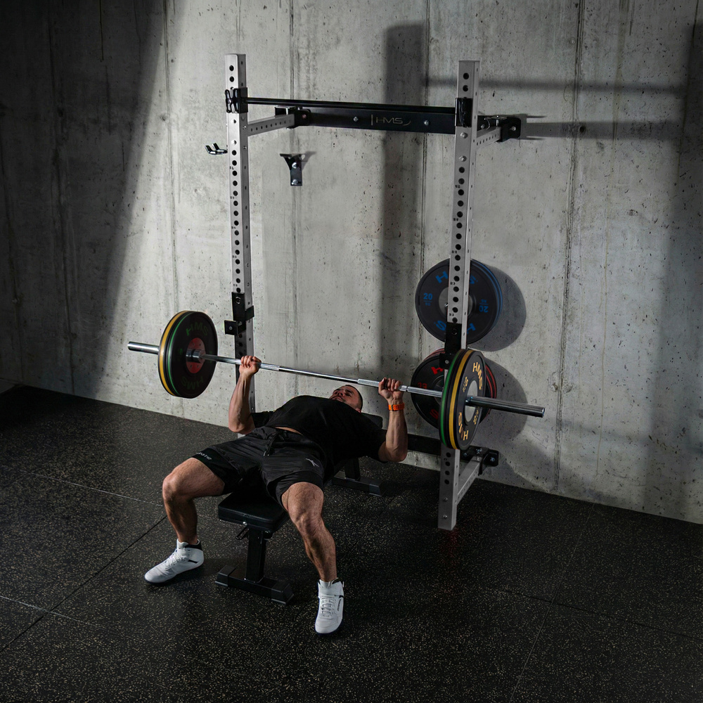 Solidna stalowa konstrukcja klatki KLT34 HMS Fitness została zaprojektowana z myślą o intensywnym treningu siłowym: