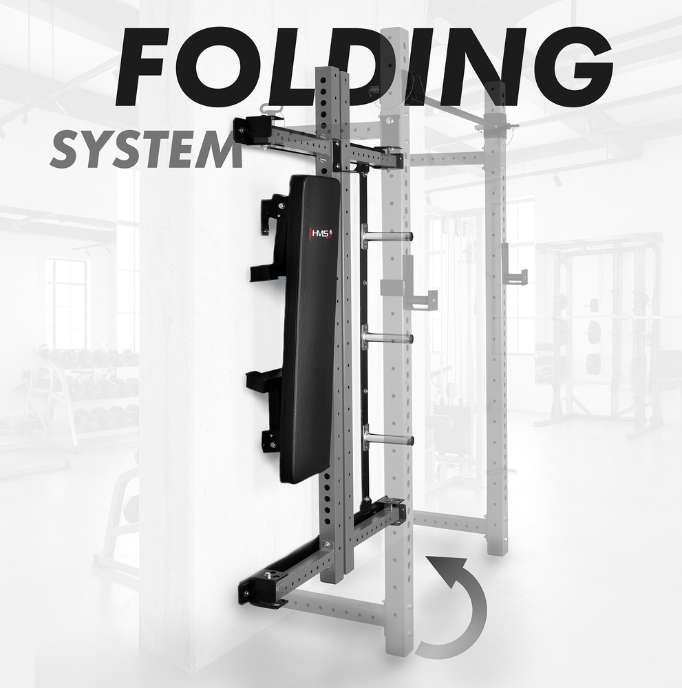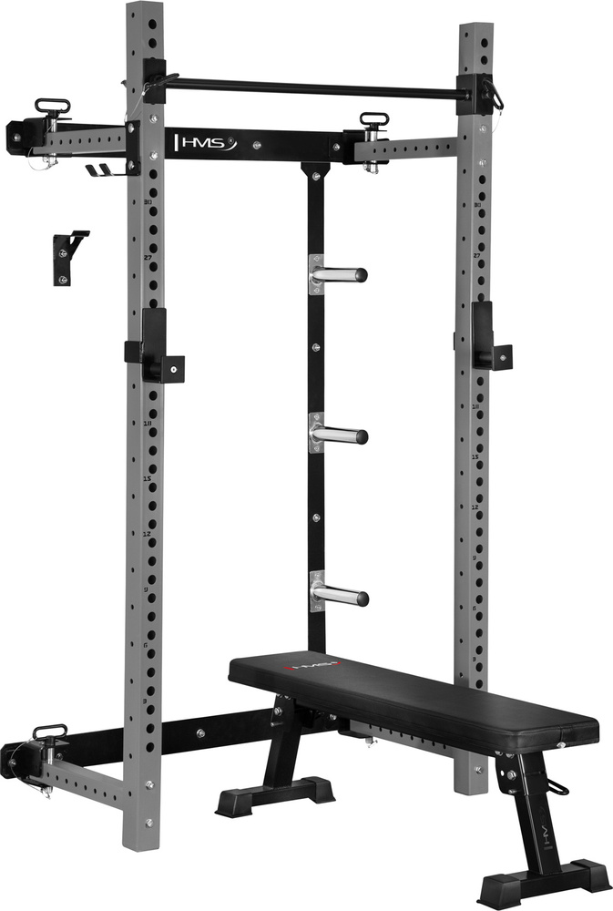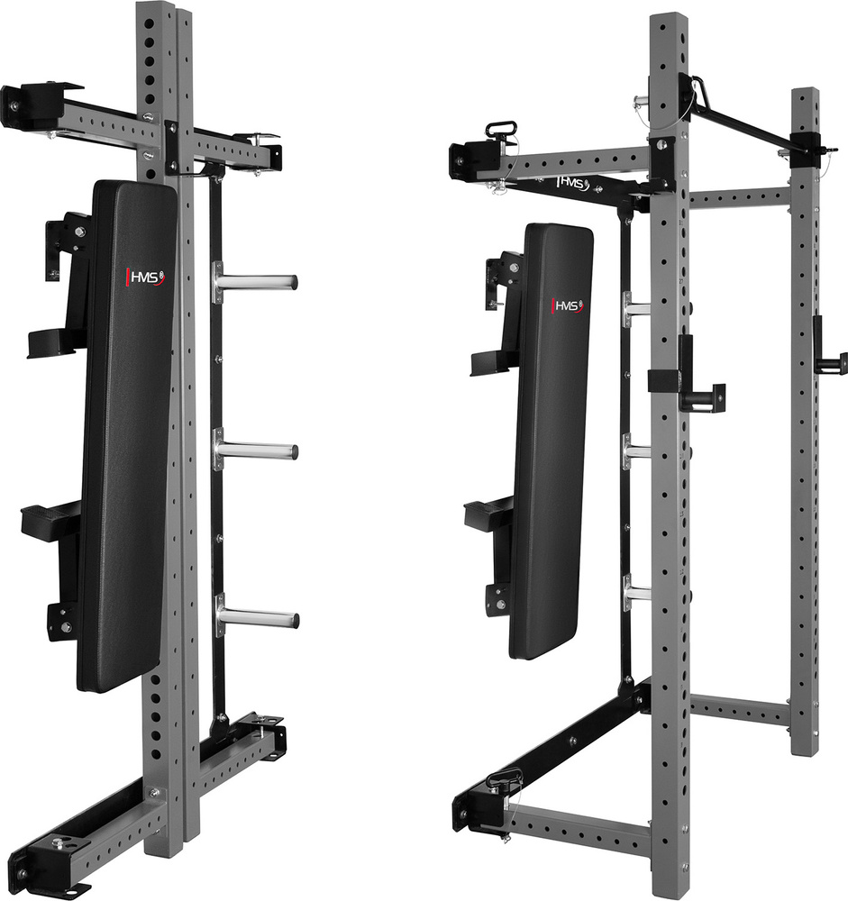 Klatka KLT34 HMS Fitness została wyposażona w składaną ławkę treningową, która umożliwia wykonywanie m.in. wyciskania sztangi, ćwiczeń z hantlami oraz treningu mięśni brzucha.