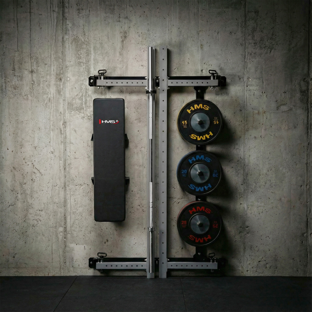 Po zakończonym treningu konstrukcję można zsunąć do ściany, znacząco ograniczając zajmowaną przestrzeń i zachowując pełną ergonomię domowej siłowni.