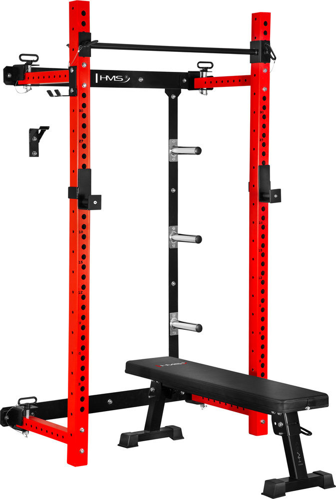 Klatka KLT34 HMS Fitness została wyposażona w składaną ławkę treningową, która umożliwia wykonywanie m.in. wyciskania sztangi, ćwiczeń z hantlami oraz treningu mięśni brzucha.