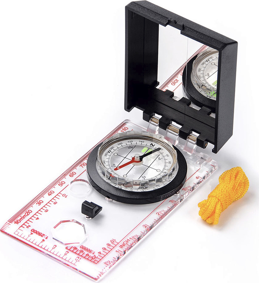 Został wyposażony w tarczę obrotową z igłą zanurzoną w niezamarzającej cieczy, składane lusterko, sznureczek do zawieszania, oraz naznaczone świecącymi w ciemnych pomieszczeniach fluorescencyjnymi kierunkami.