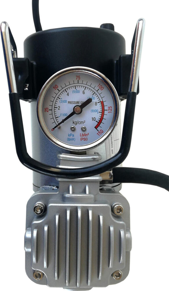 Dane techniczne:· wymiary: 18 cm (szerokość), 20 cm (wysokość do końca rączki)· maksymalne ciśnienie 100 PSI· moc: 95 W· napięcie: 220 V· kompresor z wbudowanym ciśnieniomierzem· w zestawie trzy końcówki