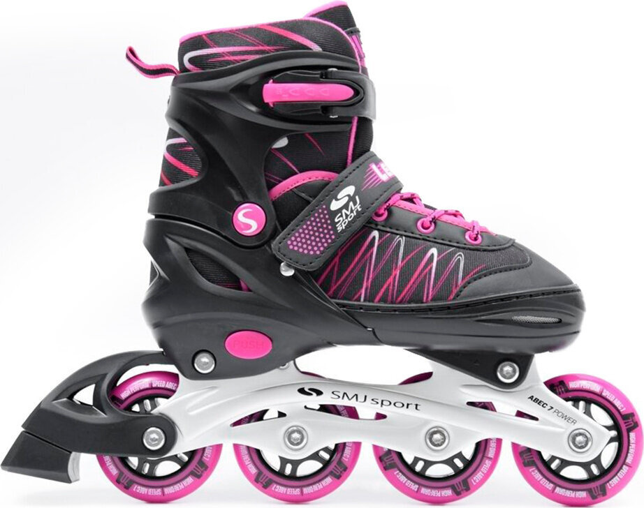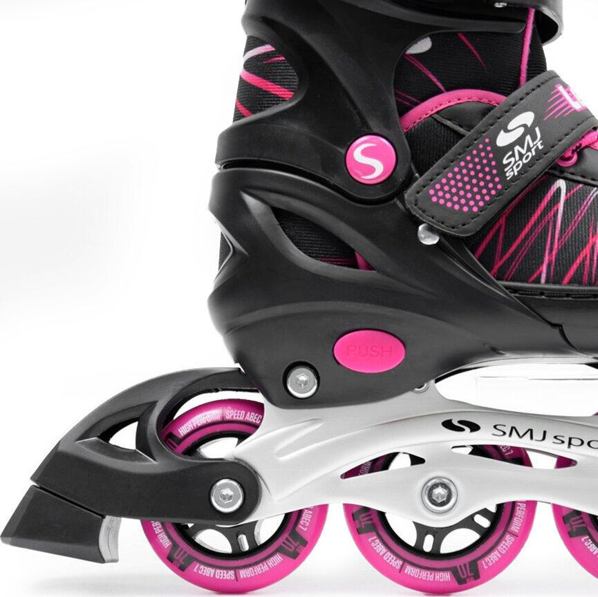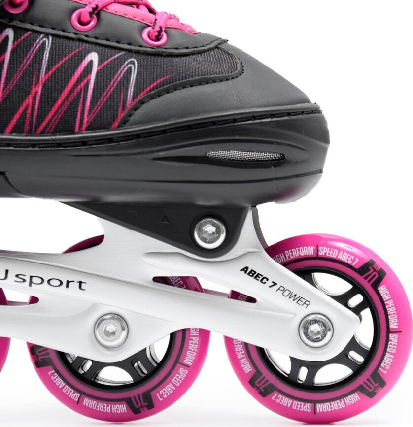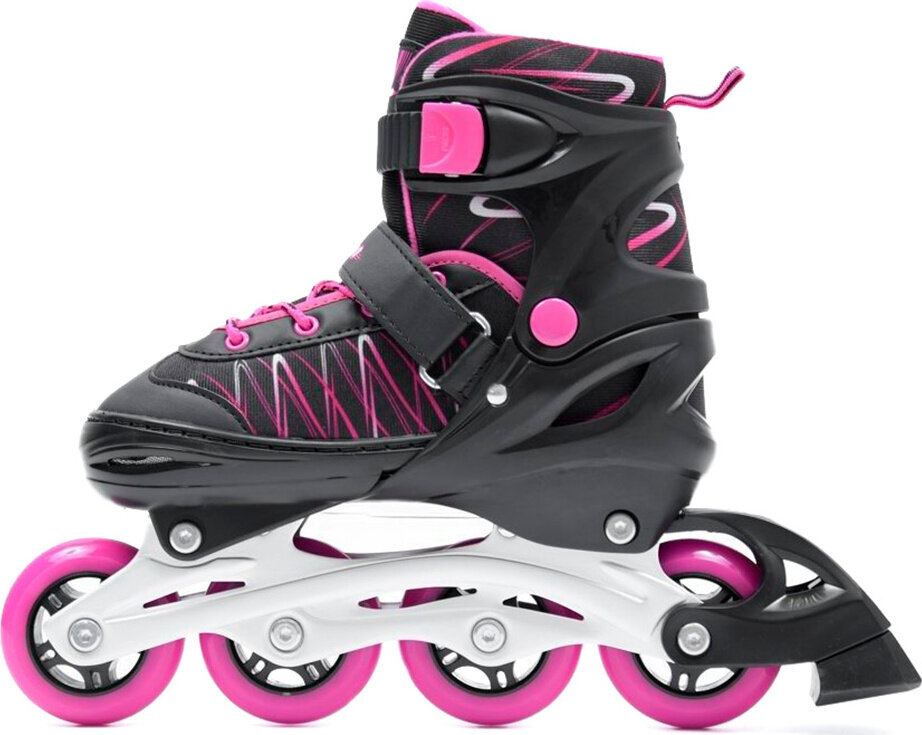Model będący połączeniem łyżew i rolek w czarno-różowej wersji zyskał bezpieczną i banalnie prostą możliwość regulacji rozmiaru bez ryzyka samoczynnego przestawienia się.