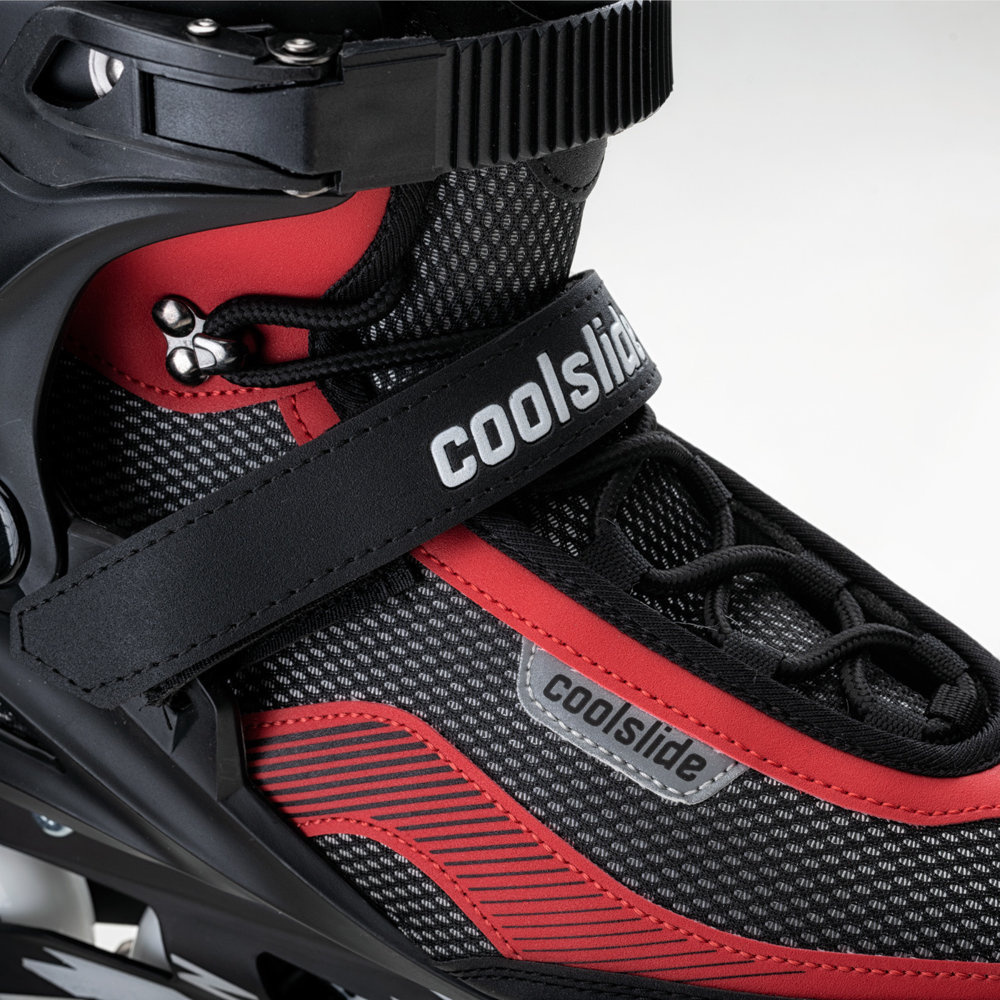 Łyżworolki męskie Roma marki Coolslide , to produkt przeznaczony dla pasjonatów jazdy. But wykonany jest z mocnego tworzywa sztucznego, posiada 3 stopniowe zapięcia - klamra, sznurowadła i rzep, zabezpieczają przed przypadkowym odpięciem. Wzmocniona część przy kostce.