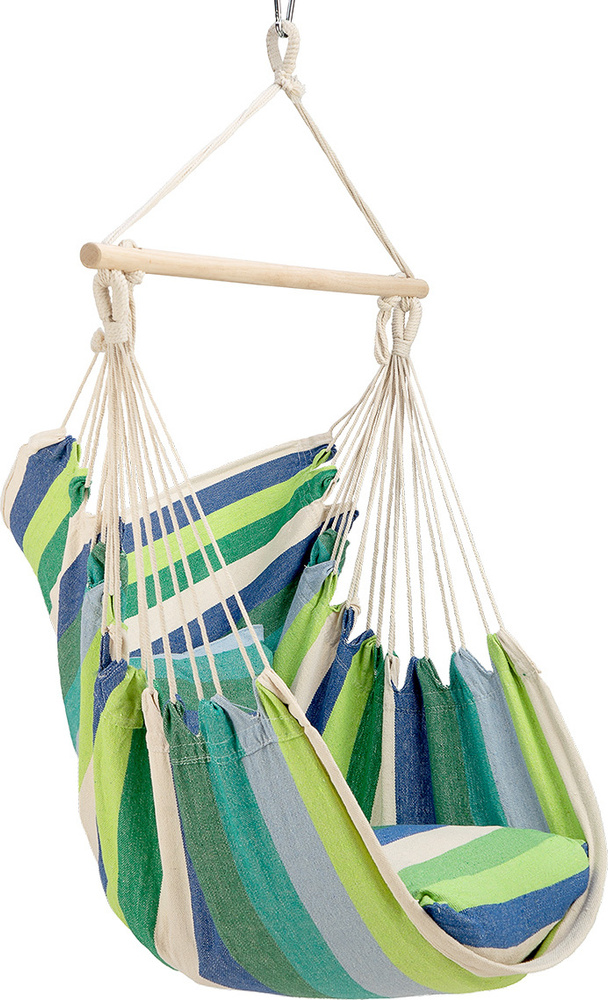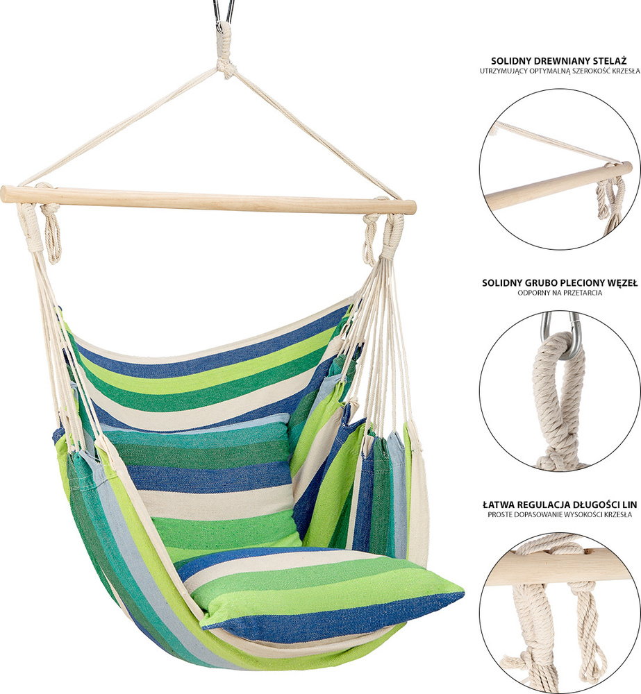 W połączeniu, z grubo plecionymi, mocnymi linami, solidnym drewnianym stelażem oraz metalowym uchwytem, otrzymujemy maksymalne dopuszczalne obciążenie, na poziomie 100 kg.
