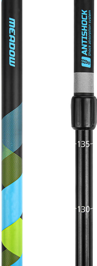 Dane techniczne:· materiał: aluminium 6061· ilość sekcji: 2· rączki: PP· mocowanie rękawiczki: standardowe· zapięcie sekcji kija: wewnętrzne· amortyzacja: tak· grot: widłowy· talerzyk: wymienny· długość: 105-135 cm· długość po złożeniu: 85 cm· w zestawie: gumowe końcówki do kijów· system Anti-Shock