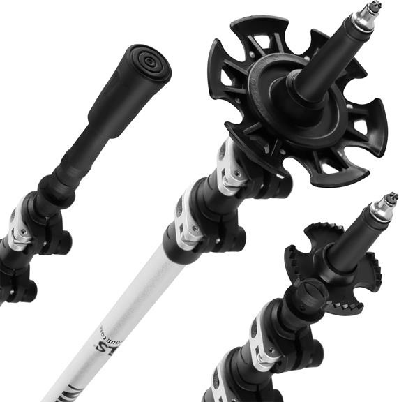 - System zacisków: zapewnia wygodną i stabilną regulację długości kijów.