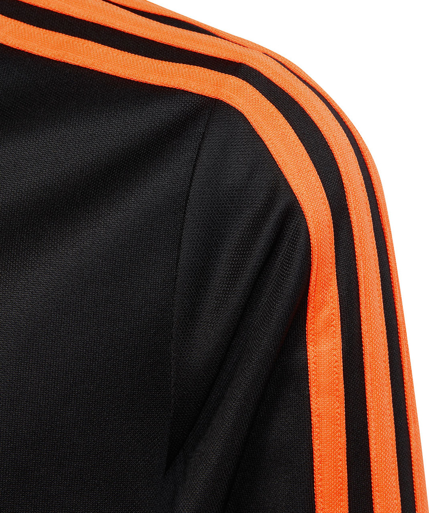 Pomarańczowe paski na ramionach oraz subtelne logo wyróżniają się na czarnym tle i podkreślają klasyczny, piłkarski styl bluzy adidas.
