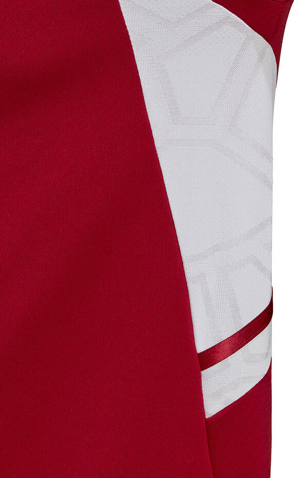 W czerwoną kolorystykę wpleciono białe wstawki oraz subtelne logo, co tworzy spójną całość wpasowującą się w sportowe zestawienia.