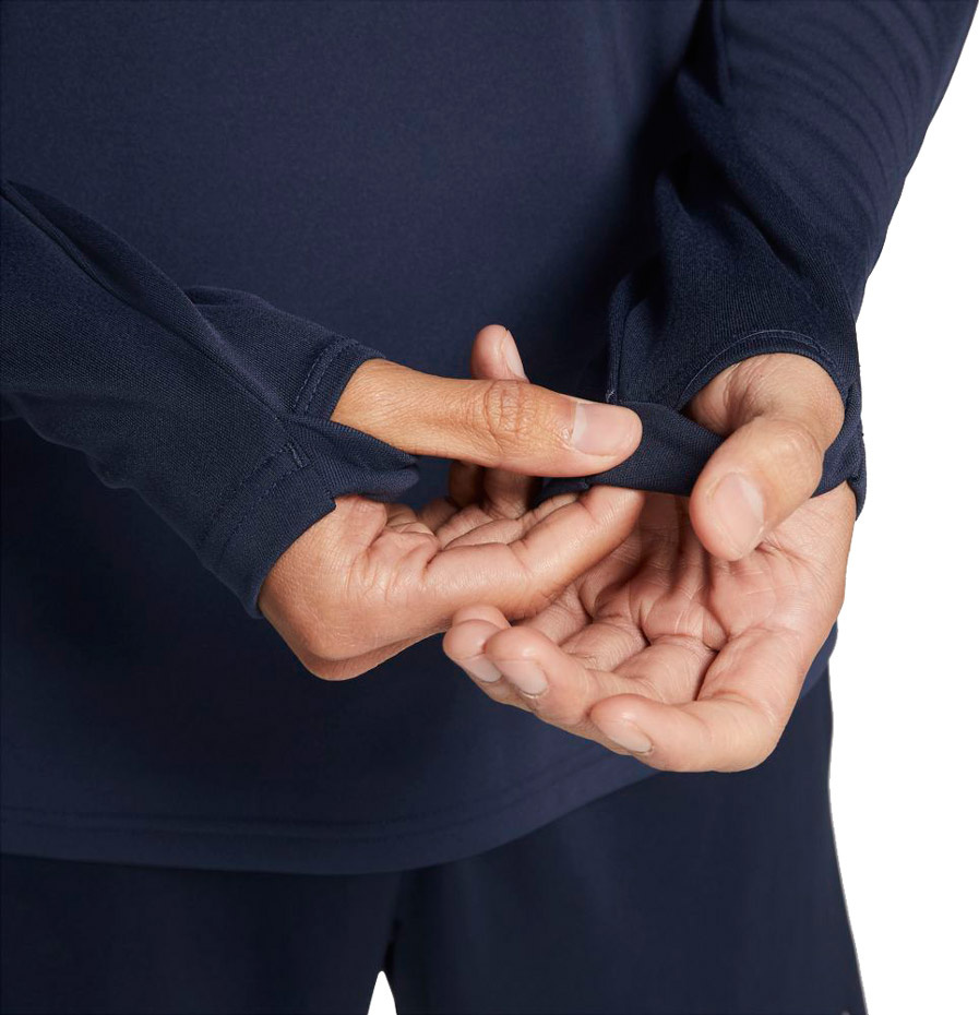 Długie rękawy wykończono otworami na kciuki, które chronią przed chłodem i zapobiegają przesuwaniu się rękawów w trakcie aktywności.