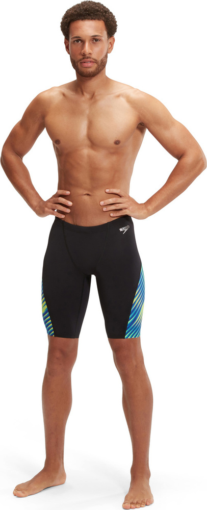 Nosząc te przylegające do ciała, czarne spodenki kąpielowe do kolan z wyrazistym niebiesko-zielonym nadrukiem na obu nogawkach, przypominającym łuki skrzelowe rekina, łowisz nowe rekordy osobiste.
