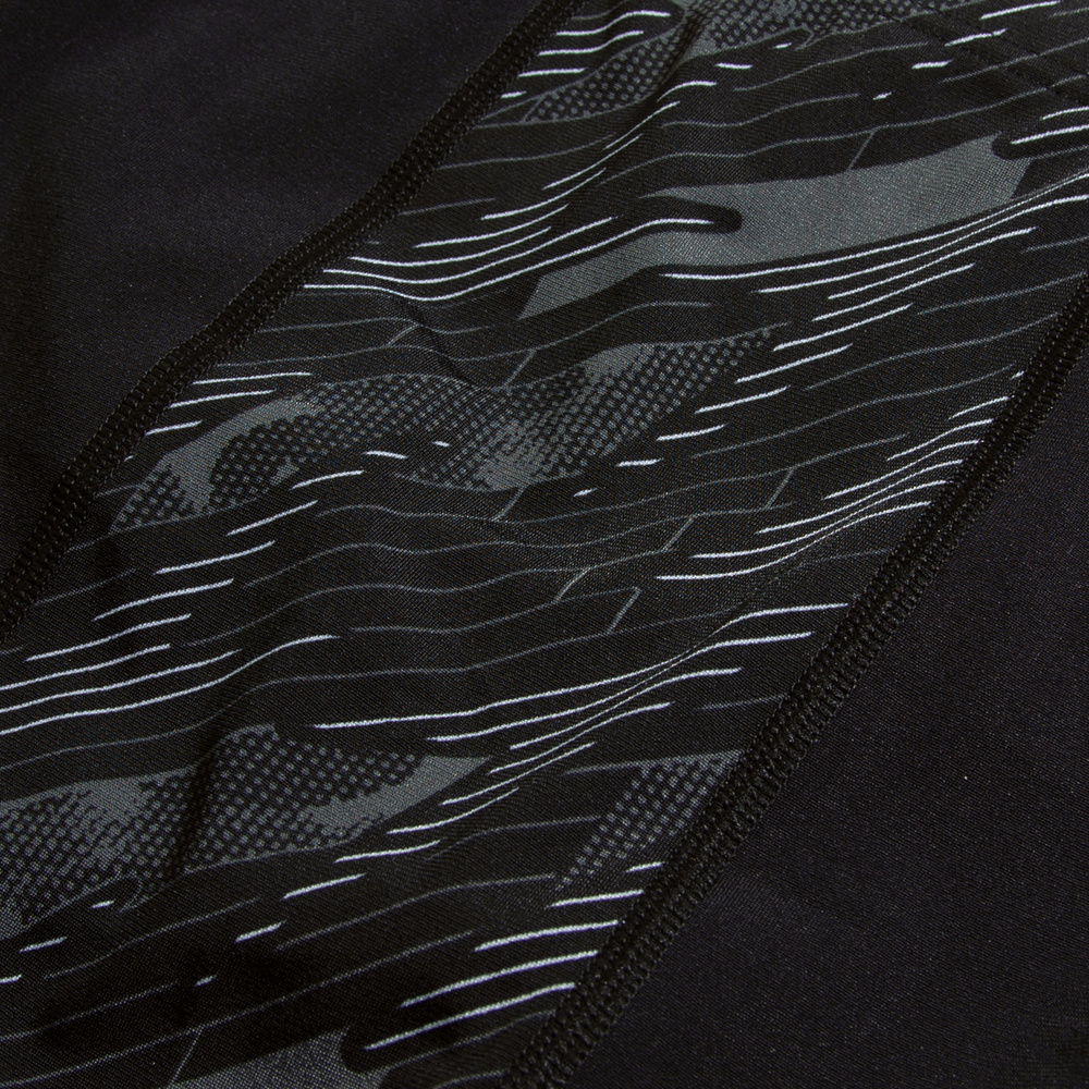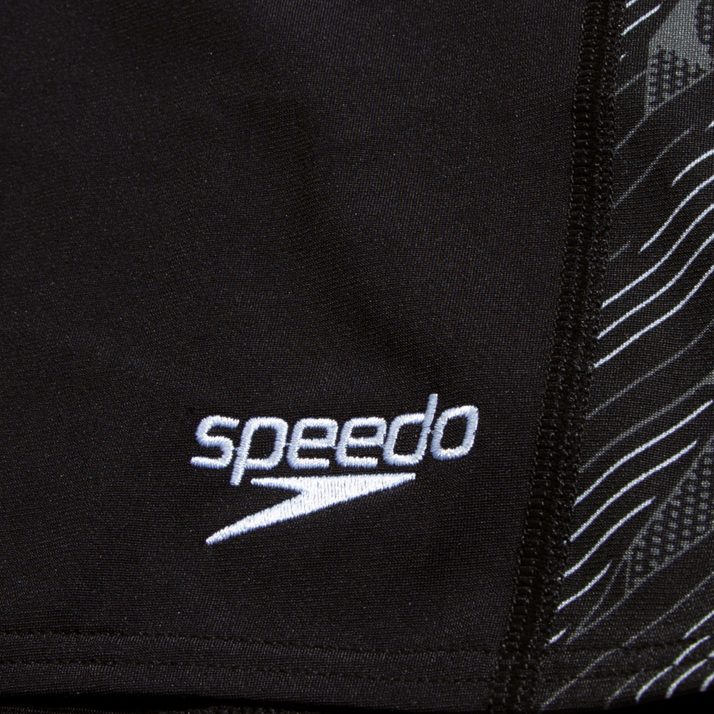 Stwórz wyrazisty look w tych gładkich, czarnych bokserkach kąpielowych zawierających boczną wstawkę z grafiką hyper boom w odcieniach szarości i bieli.