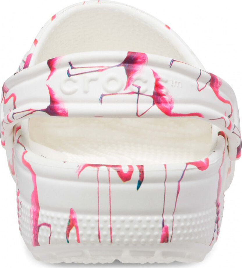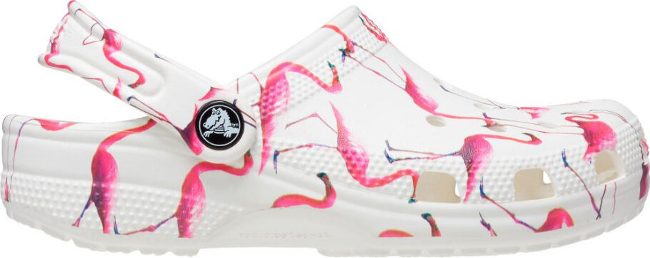 Chodaki Crocs dla dzieci zaprezentowane w kolorze białym uzupełnione grafiką z flamingami to absolutny hit na lato.