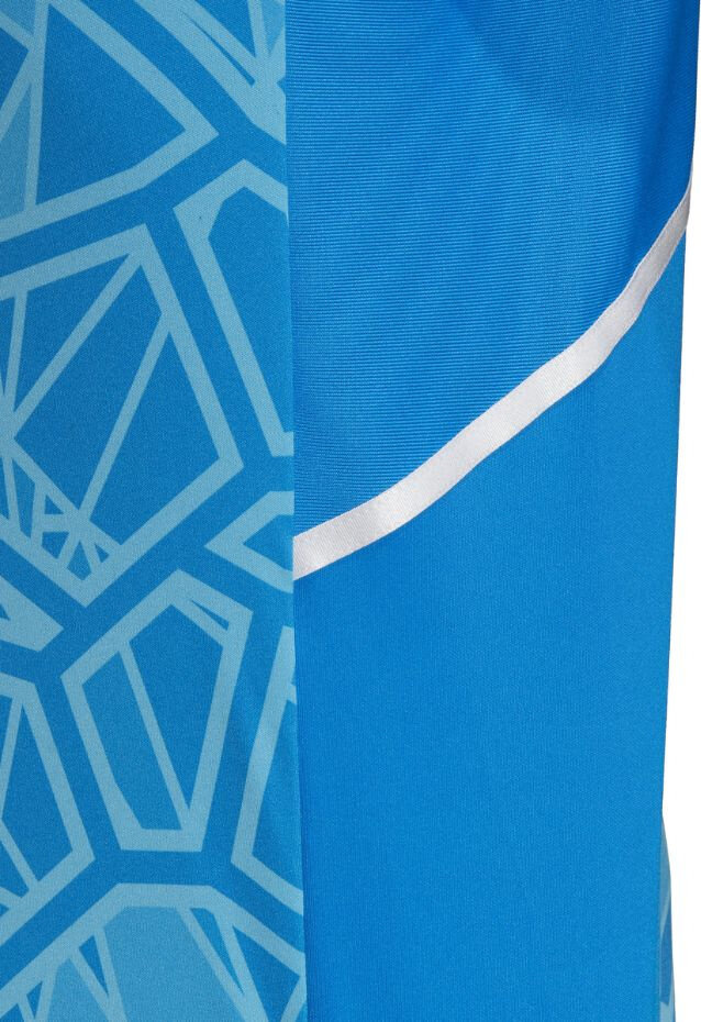 Niebieska kolorystyka z przyciągającą uwagę grafiką tworzą nowoczesny projekt, a paski na ramionach i subtelne logo podkreślają Twoje przywiązanie do sportowego stylu.