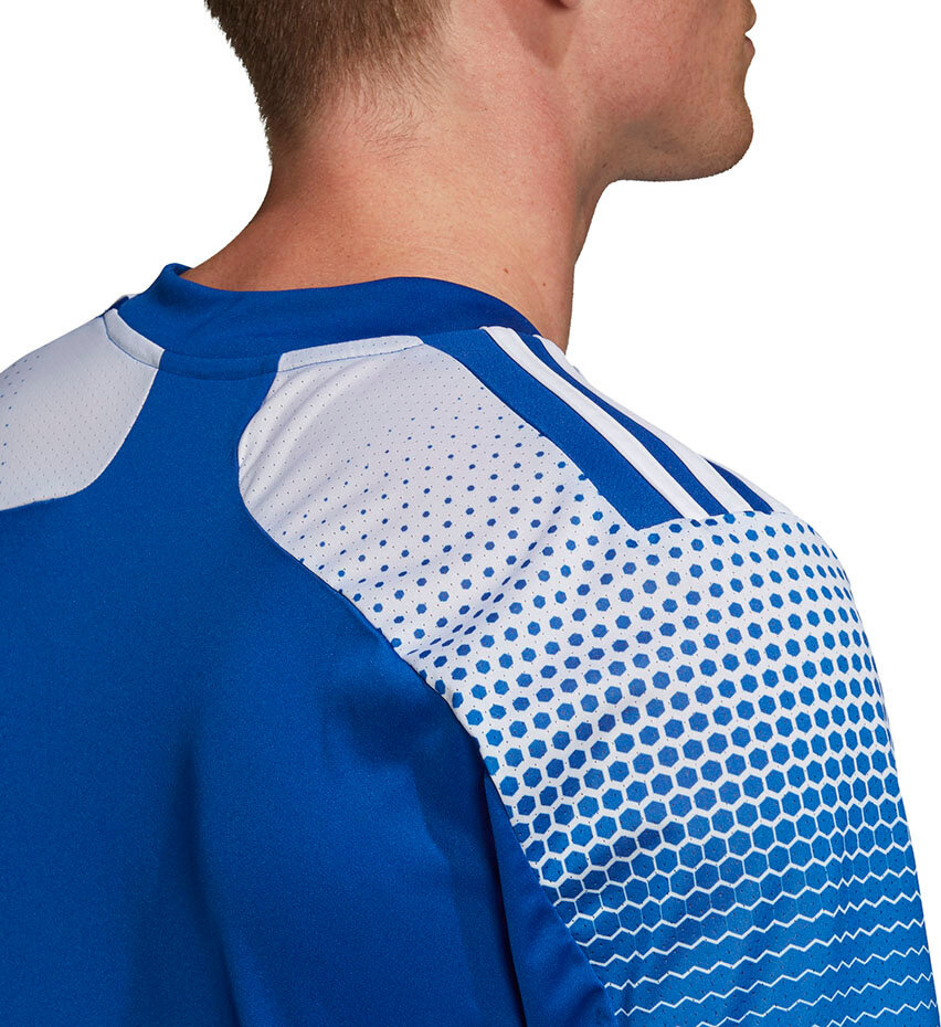 Niebieska koszulka adidas z wyszywanym logo brandu na piersi i oryginalną grafiką na rękawach jest modnym uzupełnieniem piłkarskiego stroju.