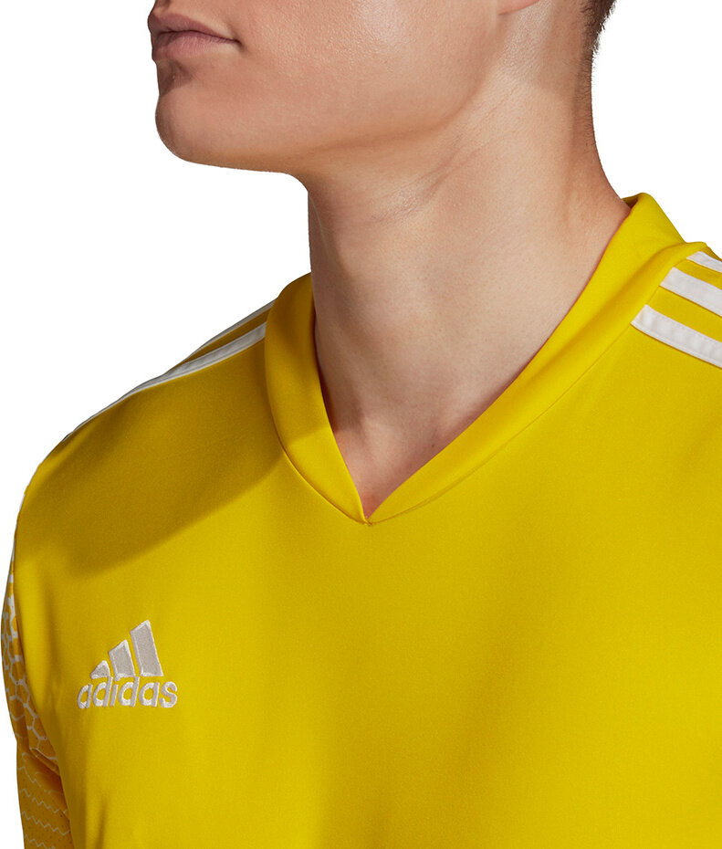 Nie daj się zatrzymać na boisku i poprowadź swoją drużynę do pewnego zwycięstwa, mając na sobie męską koszulkę adidas. Żółta koszulka adidas z wyszywanym logo brandu na piersi, paskami na ramionach i oryginalną grafiką na rękawach jest energetycznym uzupełnieniem piłkarskiego stroju.
