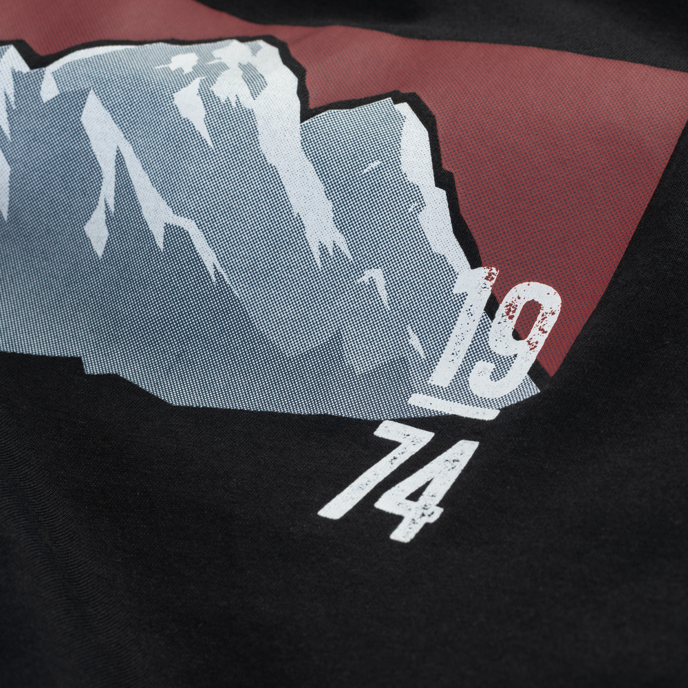 Na jednolitym tle umieszczono grafikę nawiązującą do górskiej pasji.