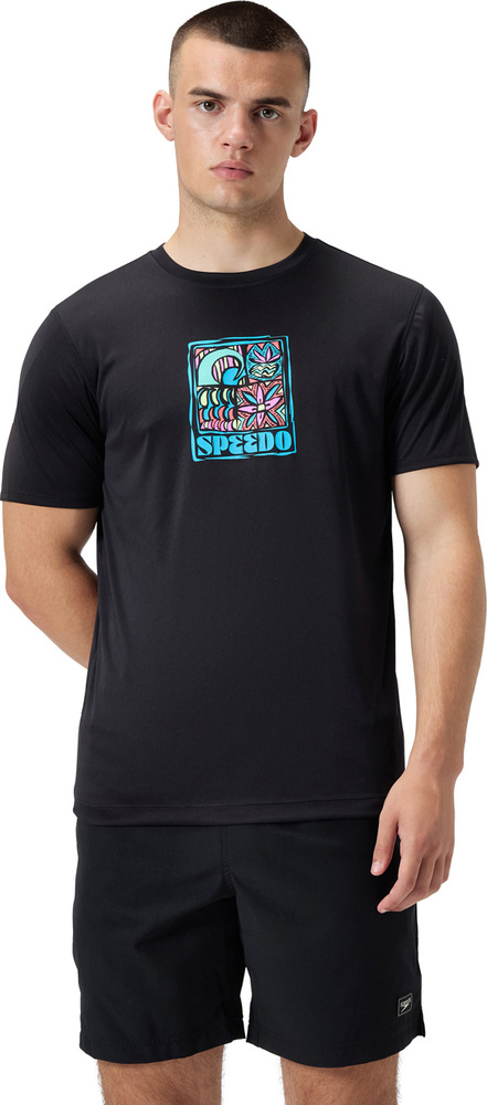 Czarna koszulka pływacka z krótkim rękawem i grafiką w stylu retro.