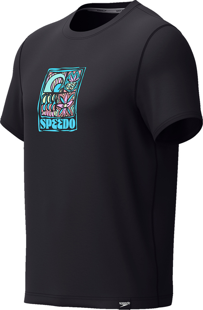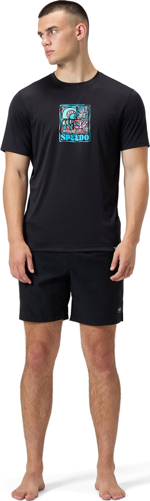 Czarna koszulka pływacka z krótkim rękawem i grafiką w stylu retro.